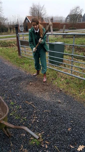 - Fleur repareert met de pikhouweel (levensgevaarlijk!!!!!) een gat in de weg.