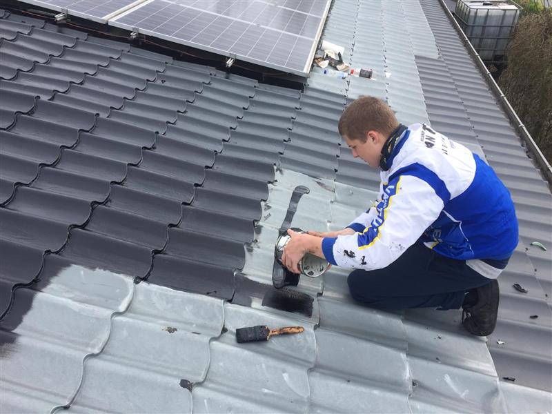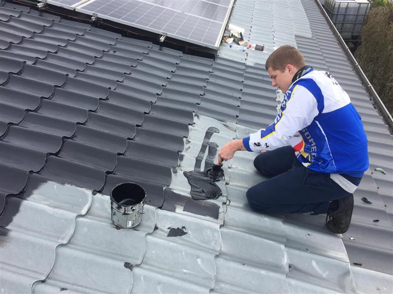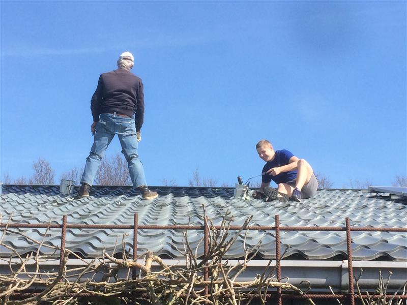 die bij gebrek aan schoolverplichtingen z’n opa komt helpen de dakklus te doen.